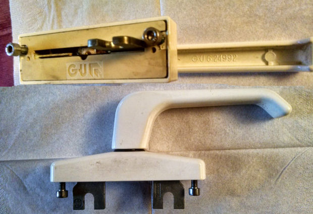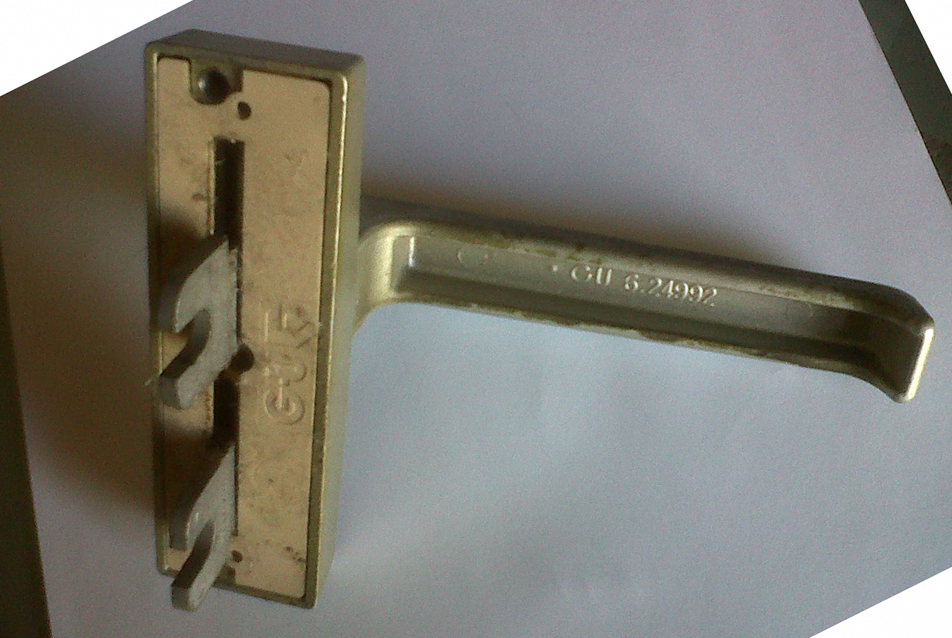 Poignée de porte fenêtre aluminium couleur champagne , portant le logo GU avec un chevron, et la référence GU 6.24992