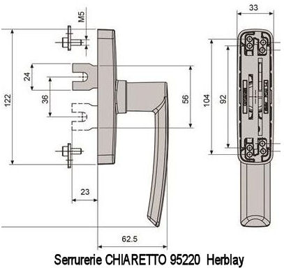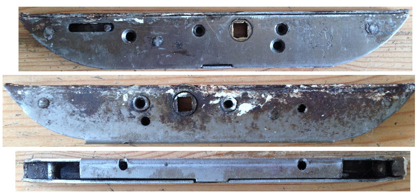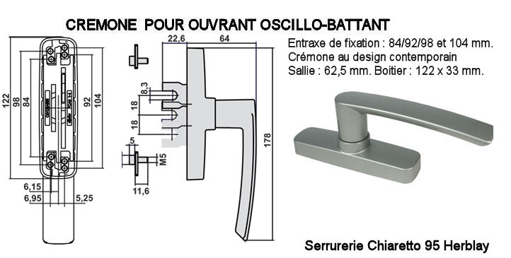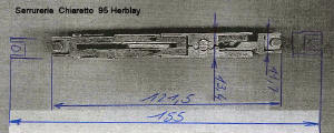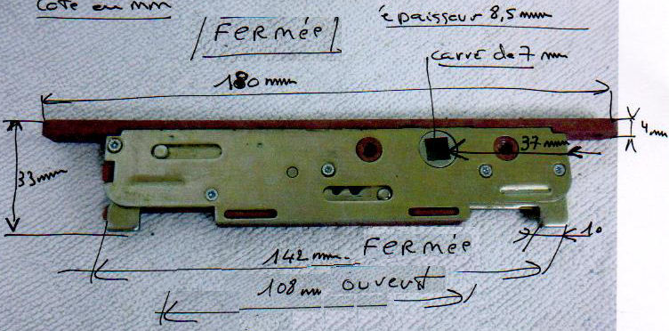 Dimensions platine 140 mm largeur 18 mm entre axe trous de fixation 120 mm cette crémone n'existe plus ttc (2015) |