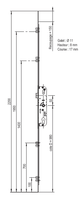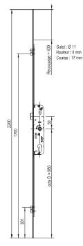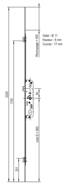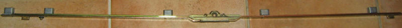 crémone pour porte fenêtre sans marque axe à 15 mm avec 1 panneton et un point haut et bas Cote D 980 longueur total 1870mm têtière de 16 mm Cette crémone n'existe plus mais nous avons un modèle de remplacement