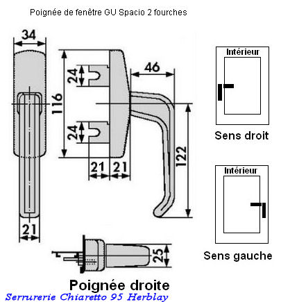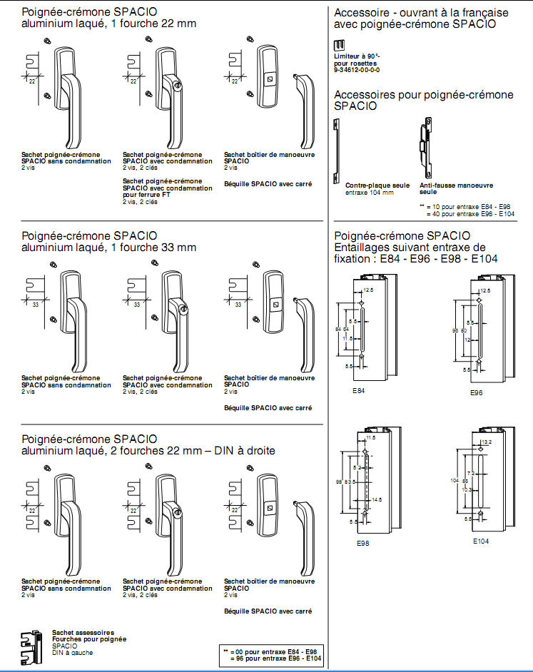 Sinon nous avons une solution de remplacement La référence E 14705 est un composant de cette poignée. Pour un éventuel remplacement, il faut prévoir une poignée SPACIO dont la référence est à déterminer selon : · Longueur de la fourche : 22 mm ou 33 mm ? · Entraxe de fixation : 84, 96, 98 ou 104 mm ? Voir notre doc ci contre, chapitre Oscillo-battant, Ferrure JET AK8.