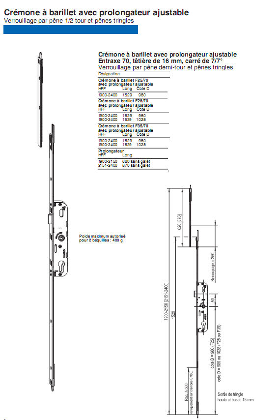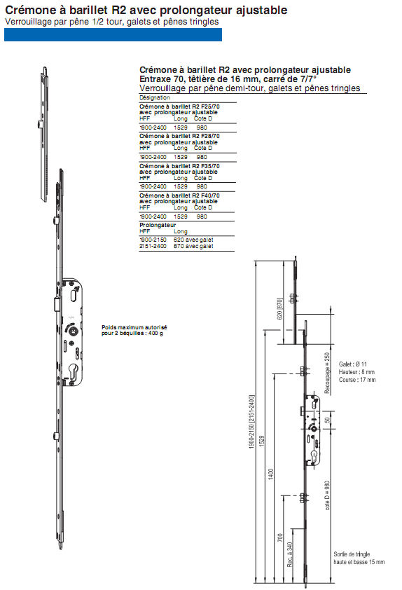 Crémone à barillet R2 avec prolongateur ajustable Verrouillage par pêne 1/2 tour, galets et pênes tringles |
