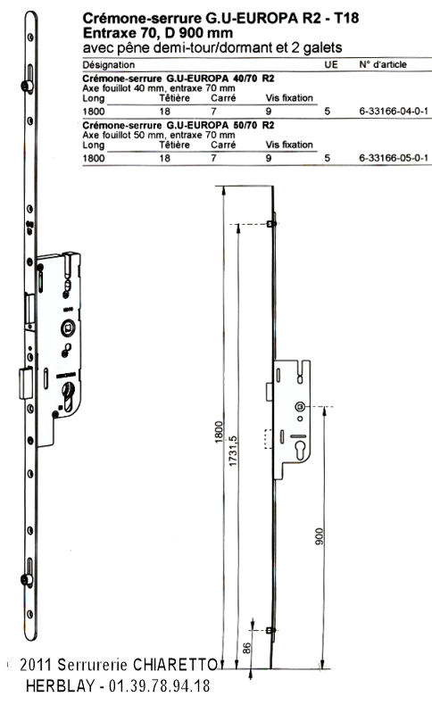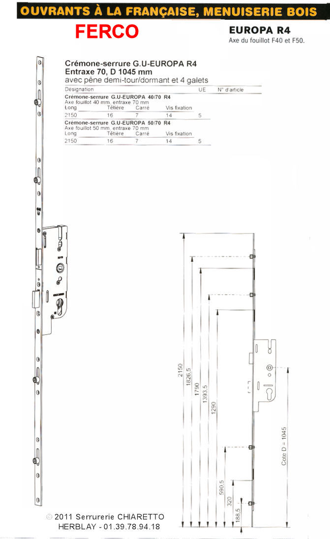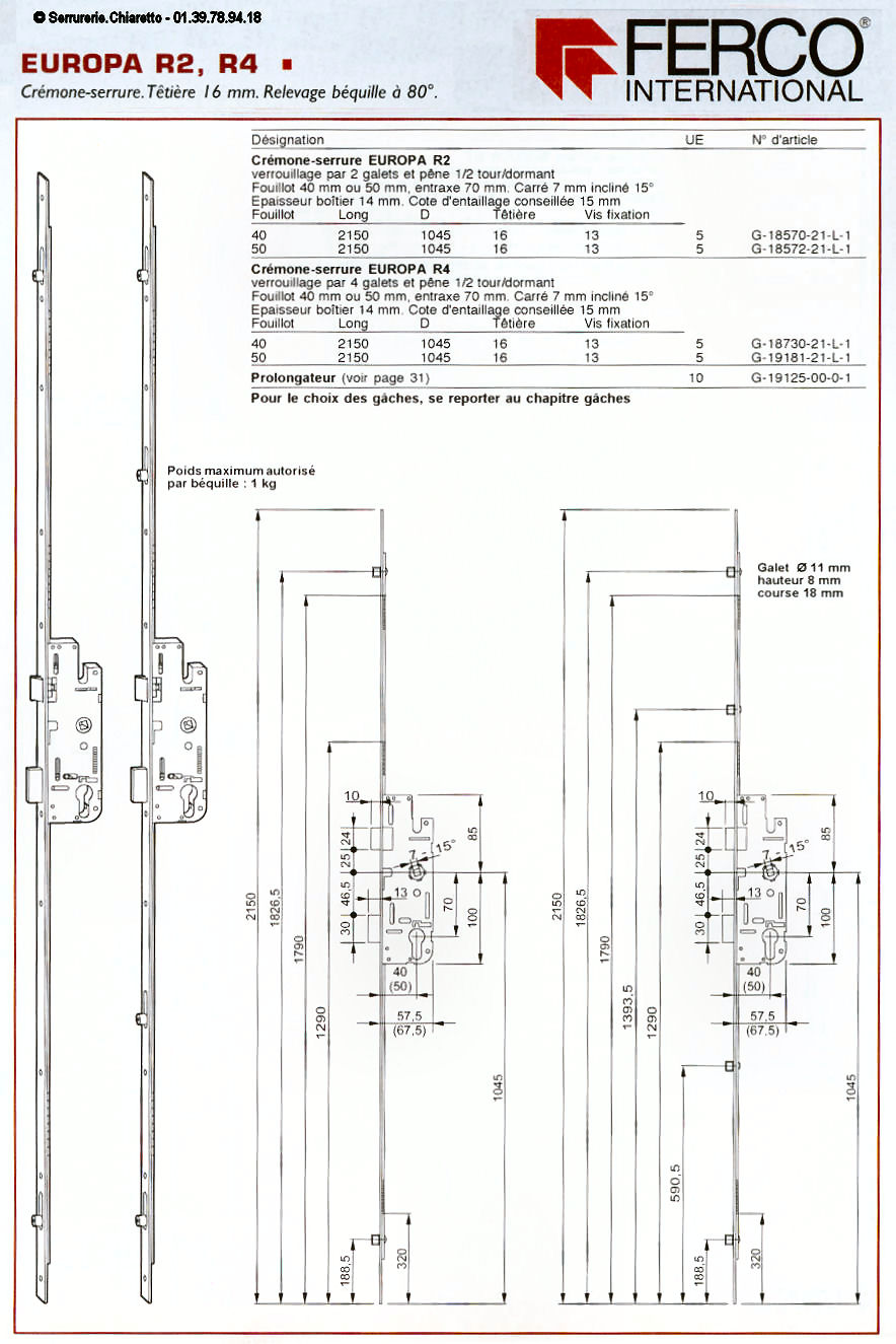 Crémone serrure EUROPA R2, R4 ancien Modèle