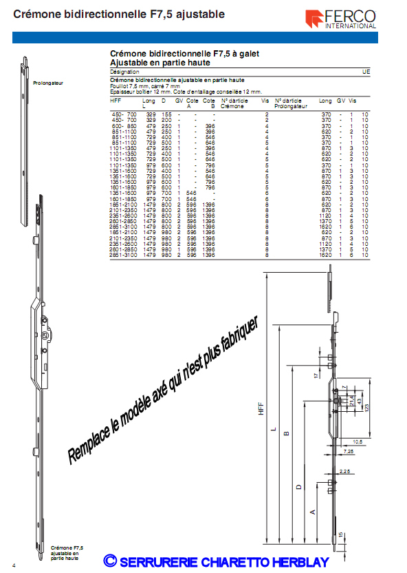 Crémone Bidirectionnelle F7,5 AJUSTABLE Remplace le modèle axé bidirectionnelle ou à inverseur qui n'ai plus fabriquer ( si besoin il faut déplacer les gâches ) Pour info: Bidirectionnelle ou inverseur Pour info: Bidirectionnelle: les galets du haut à la fermeture monte vers le haut te les galet du bas descende vers le bas avec l'inverseur les galet du haut et du bas monte, mais dans les deux cas l'action de la crémone entraîne les pênes haut et bas vers la sortie. |