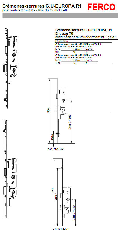 Crémones-serrures G.U-EUROPA R1 pour portes fermières - Axe du fouillot F40