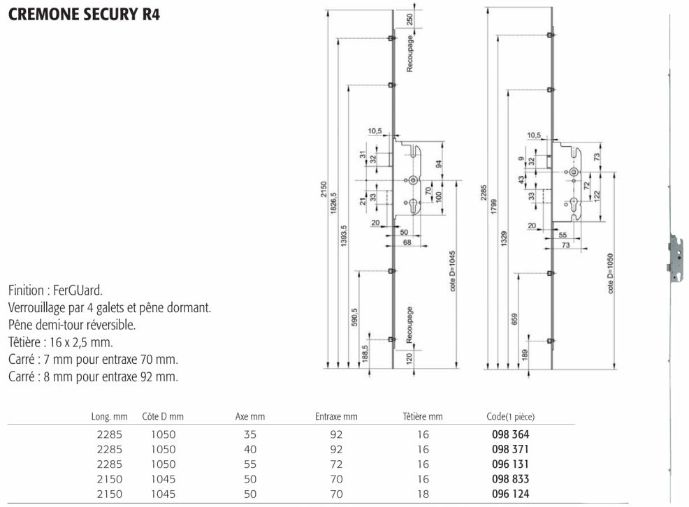 Secury R4 Axe à 35 ou 40 mm, entraxe entraxe 92 mm Têtière de 16 mm - Sur commande 3/4 jours FERCO - GU Crémone serrure pour porte d'entrée ou porte fenêtre pvc ou bois |